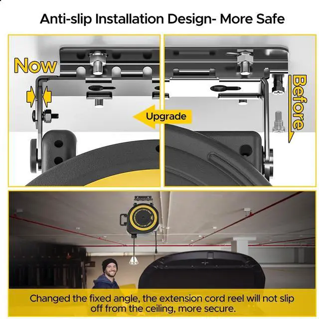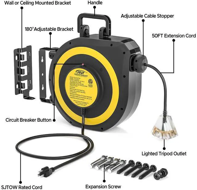 - [Automatic Retraction]The retractable extension cord reel features a high-precision automatic retraction mechanism, designed to eliminate tangling and ensure seamless cord management. Its smart ratchet system securely locks the cord at any desired length, while the adjustable stopper allows you to customize the extension length effortlessly. During use, simply retract the cord smoothly into the reel with minimal effort, and instantly adjust the exposed length to meet your needsperfect for workshops, garages, or outdoor.
