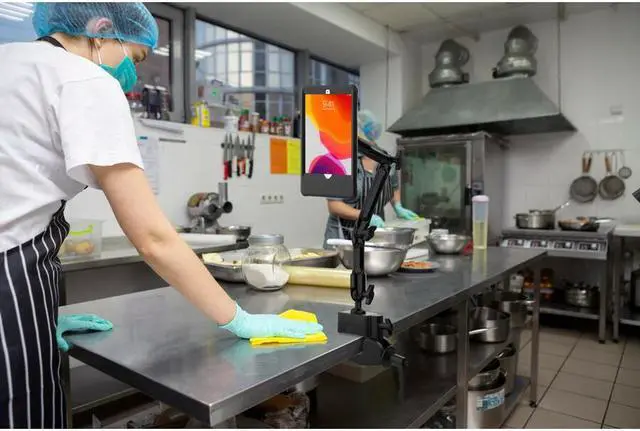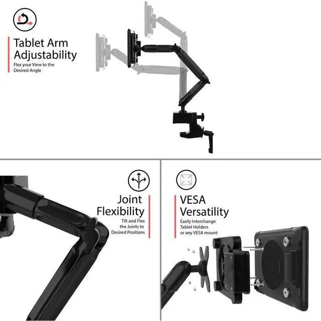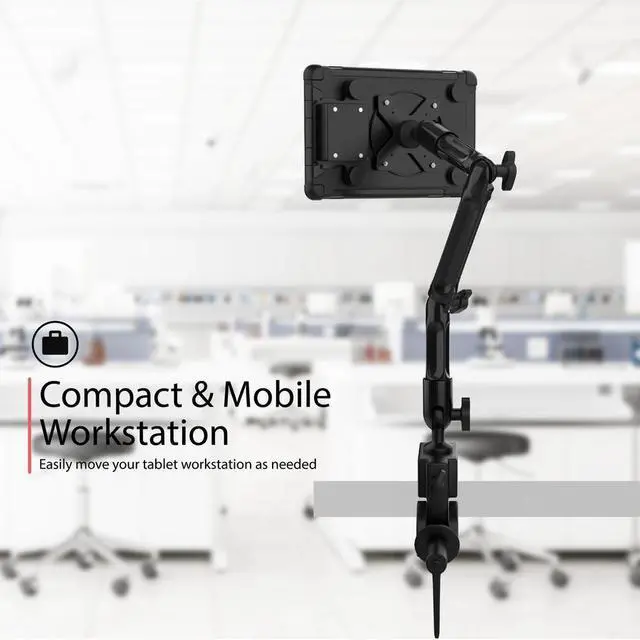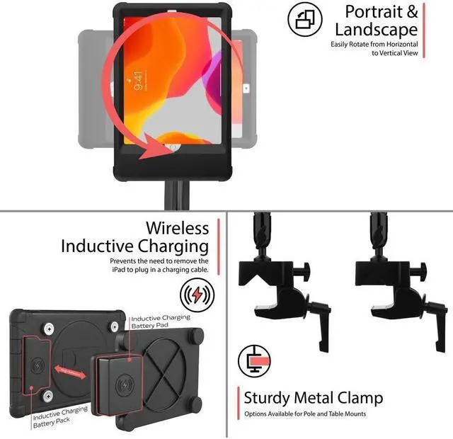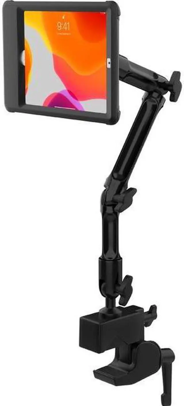 | Features | Wireless charging function Durable impact shielding Rugged rubber construction Water resistant Includes VESA 75 x 75 and 100 x 100-millimeter mounting plates Embedded magnet allows for quick mounting to the inductive charging back plate Allows full access to charge port, speakers, camera, and home button Heavy-duty clamp grips tabletops or poles Two 180-degree rotating joints Two omnidirectional ball sockets at base and headpiece Allows portrait and landscape displays Galvanized steel security cable anchors stand to table, desk, or another permanent fixture Compatible with iPad 7th and 8th Generation 10.2-inch, iPad Pro 10.5-inch, iPad Air 3 |