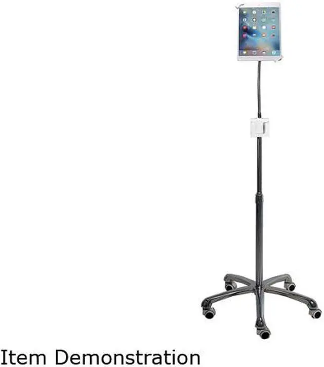 • Height-adjusting, telescoping pole; Tilting, 360-degree rotating tablet holder
