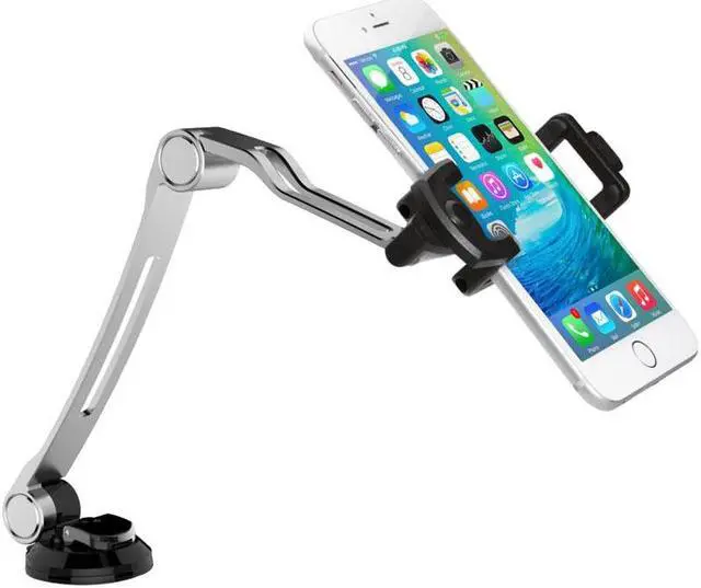| Features | Compact smartphone arm mount folds flat for maximum portability Suction grip attaches to flat surfaces with simple lock-and-release mechanism Two flexible arm joints Spring-loaded phone holder with 360 degree rotation Compatible with smartphones up to 3.5 inches in width, including the iPhone 6S Plus, Galaxy S6, Nexus 6, and more |