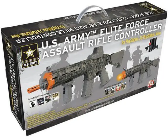 The U.S. Army Elite Force Assault Rifle designed by CTA Digital for PlayStation 3 & Move compatible games is the ultimate weapon for realistic battlefield combat. This unique rifle controller, modeled after actual military equipment has every button featured on a standard PS3 Dualshock controller, including clickable thumb sticks for strafing, running, steadying your weapon and looking around within the game environment. It also includes a rumble effect similar to the PS3 Dualshock. To sync wirelessly, all you need to do is plug the USB antenna into the console and press the home button on the Assault Rifle. That's it! Perfect for titles such as Call of Duty: Modern Warfare 3, Call of Duty: Black Ops, or Battlefield 3 with the R1 button mapped to the trigger. Using the U.S. Army Elite Force Assault Rifle Controller from CTA Digital, there's no need to toggle back to your standard PS3 controller.