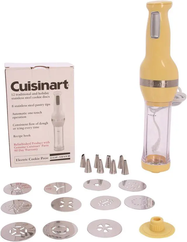 Fast yet functionalThe Cuisinart CCP-10YFR is capable of making perfect cookies in minutes. With 12 traditional and holiday stainless steel cookie discs and 8 designer stainless steel pastry tips included, this cookie press ensures that all the cookies look professional with different shapes and decorations.