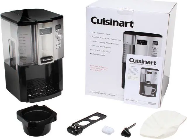 | Features | Cuisinart keeps the coffee flowing! The new Coffee on Demand carafe-free coffeemaker delivers up to 12 cups of hot coffee cup by cup, and now there's a removable water reservoir to make fill-ups easier than ever. With our exclusive Coffee Gauge on the front of the unit to count down cups remaining, 24-hour programmability and adjustable auto shutoff, this is every coffee lover's dream machine! Features Dispenses one cup at a time with an easy-to-use actuator Dispenser light comes on when you press the lever to fill your cup Removable water reservoir Double-wall coffee reservoir holds twelve 5 oz. cups of coffee Removable coffee reservoir for easy cleanup Fully programmable with 24-hour advance brew start, programmable auto shutoff, self clean, and 1-4 cup setting Easy-to-read Coffee Gauge lets you know how many cups of coffee are left Removable drip tray under coffee dispenser Permanent gold-tone basket-style filter Charcoal water filter Instruction book included BPA Free |