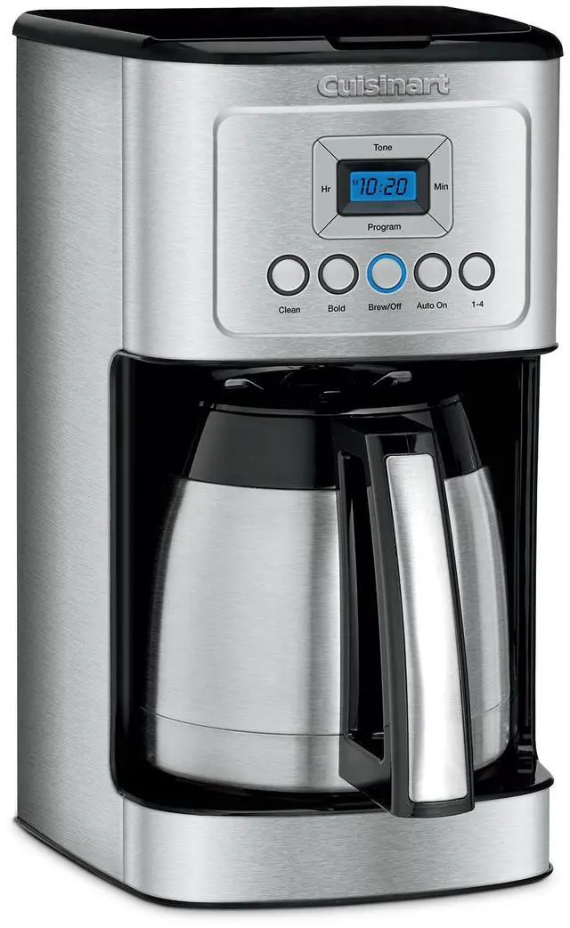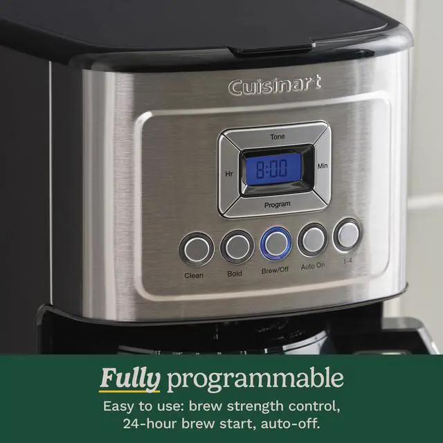 Hotter coffee and brew strength options the best of both worlds! The Cuisinart 12 Cup Programmable Thermal Coffeemaker is equipped with cutting edge coffee technology to give you hotter coffee without sacrificing taste. Choose a flavor profi le with regular or bold strength control, and set brew-time up to 24-hours ahead. Our backlit LCD is easy-to-read, a ready tone can be turned on or off, and an indicator light signals when its time to decalcify.