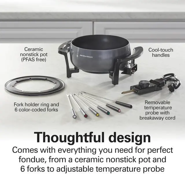 Comes with everything you need for perfect fondue, from a ceramic nonstick pot with cool-touch handles to 6 color-coded forks, fork holder ring and adjustable temperature probe with breakaway cord.