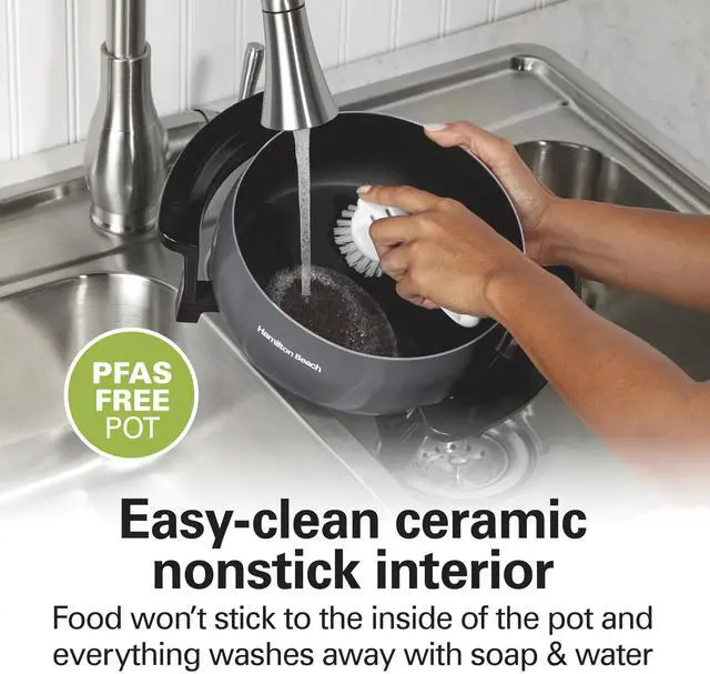 - PFAS-free ceramic nonstick interior so cleanup is easy, and it has cool-touch handles for easy carrying.