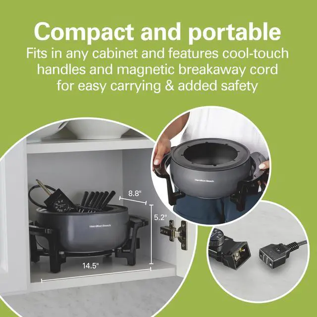 - Fits in any cabinet and features cool-touch handles and magnetic breakaway cord for easy carrying and added safety.