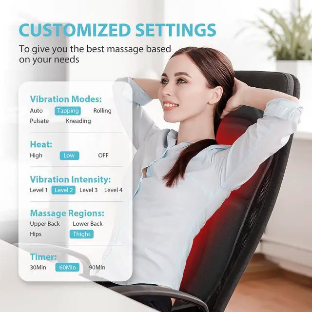 Personalized Massage Settings: With 5 vibration modes and 4 intensity levels, this heated back massager chair pad adapts to your needs. Whether you need light relaxation after a long day or stronger vibrations for deep muscle relief, its easy to customize. Simple controls make it a great massager pad for office chair users, seniors, or anyone with sensitive or chronic pain. Your comfort is just a touch away.