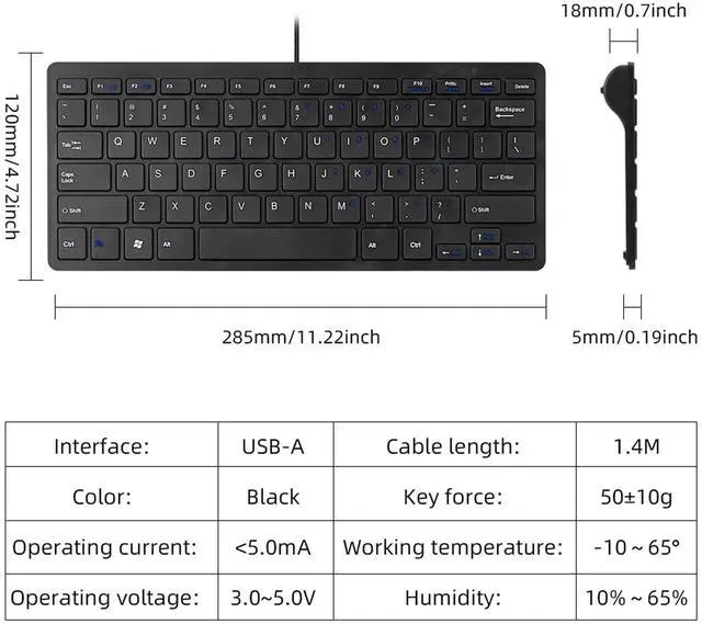Mini Keyboard: 285mm × 120mm × 18mm (13 inches) small keyboard with 1.4M USB cable, does not take up too much of your placement space, while its length can meet on the desktop or desktop under the connection with the computer.