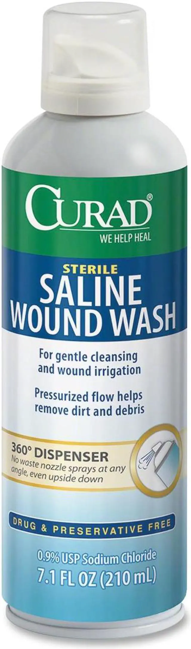 Saline wound wash is designed to gently cleanse minor cuts, scrapes and burns. Pressurized flow helps remove dirt and debris from wounds. No-waste nozzle sprays at any angle, even upside down, for convenient use. Sterile formula is drug-free and preservative-free. Saline wound wash is compliant with the AHCPR guidelines.