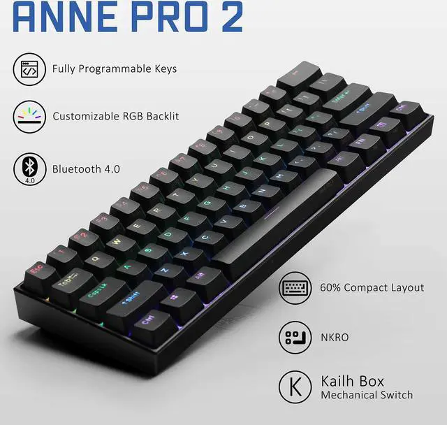 ANNE PRO 2 is a 60% size Bluetooth RGB mechanical keyboard. It’s smart and saves the space of the desk. Although there are only 61 keys, it can be used like a standard 104 -key keyboard by the key combination
