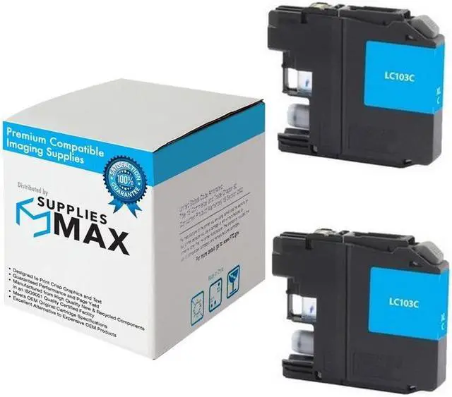 SuppliesMAX High Yield Inkjet compatible replacement for Brother LC-103C_2PK. Yields up to 600 pages at 5% coverage. Premium ink delivers vibrant color and sharp text for photos, presentations, and everyday documents. Engineered for reliable performance, long-lasting results, and seamless installation in supported 110V U.S.-based printers.