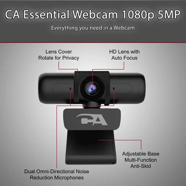The CA Essential Webcam 1080p 5MP delivers remarkably crisp, clear, and detailed images in vibrant colors. The HD Auto Focus and Light Correction adjust to the conditions to provide a consistently high definition image. The dual integrated Omni-Directional microphones capture the natural sound of your voice and the field of view is wide enough to include a second person.