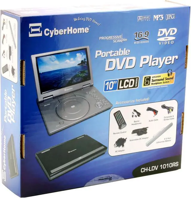 | Features | Progressive Scan Video Output with 3:2 pulldown Surround jacks for CyberHome HPS-10 surround headphones (Headphones Sold Separately) 2.5-Hour battery for power to spare Aluminum & High-Impact Plastic Case Multi-function Remote Control |