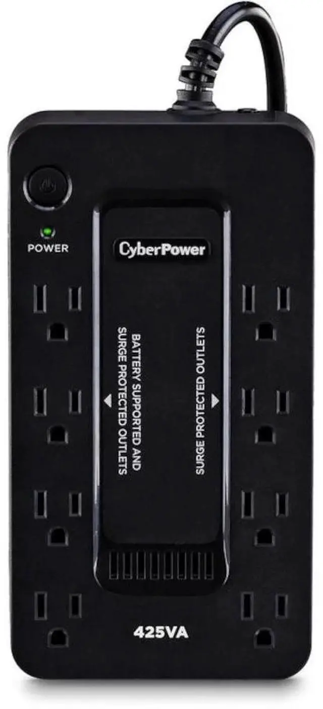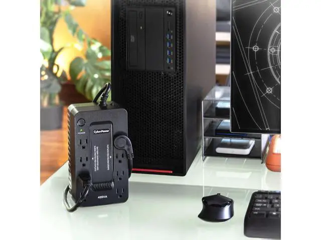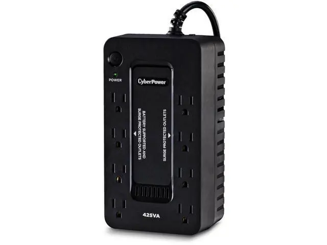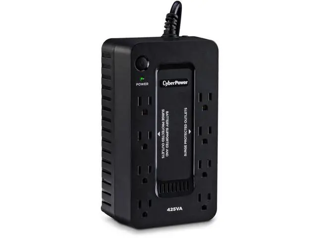 The CyberPower ST425 uninterruptible power supply (UPS) system provides battery backup and surge protection for lightning-induced surges and other power events that can damage electronic equipment. This unit delivers enough battery backup to power connected electronics through utility power failure and enough runtime to perform a proper shutdown to protect against the loss of data and damage to valuable electronics during longer outages. Including a sleek design, this UPS is perfect for all your home office and entertainment needs, including computers, gaming consoles, and broadband routers.