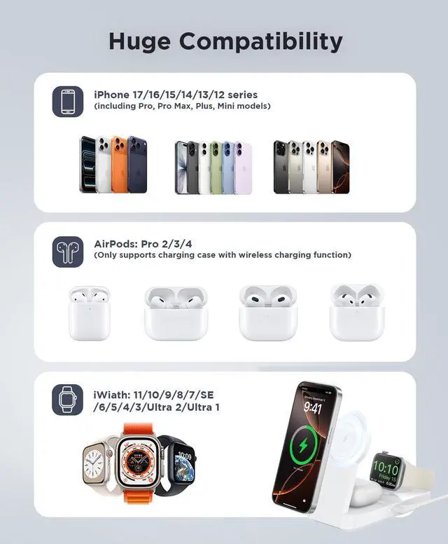 This magnetic wireless charger only supports charging for iPhone 12 - 16 Pro Max models. Cases that are thicker than 2.5mm or non-magnetic reduce charging efficiency, so their use is not recommended.