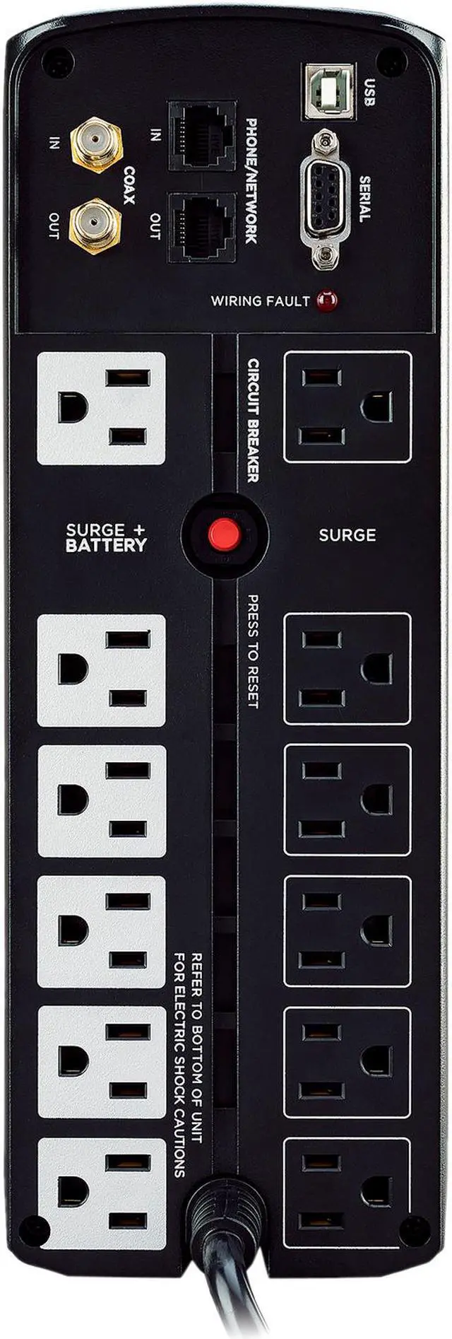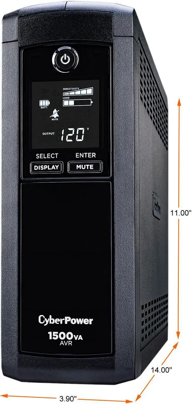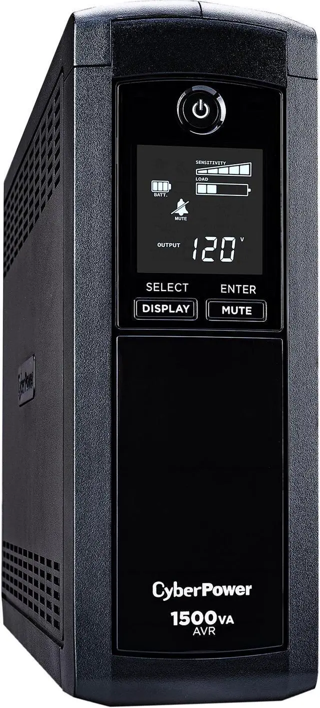 The CyberPower Intelligent LCD CP1500AVRLCD uninterruptible power supply (UPS) for mid to high-end computer systems, features dynamic line conditioning to guard against surges/spikes and offers battery backup in the event of brownouts or blackouts. Its patented GreenPower UPS advanced circuitry reduces UPS energy costs by up to 75% compared to competitive models. The CP1500AVRLCD unit has a capacity of 1500VA/900 Watts, eight (8) NEMA 5-15R receptacles, including four (4) fail-safe outlets for critical loads. The intelligent multi-function LCD panel displays real-time UPS vitals for ease of control. This unit offers connectivity via one (1) HID USB and one (1) serial port, as well as protection for phone/network (RJ11/RJ45) and cable/coax (RG-6). It has two (2) maintenance-free, user-replaceable 12V/8.5Ah batteries and includes EMI/RFI filters to increase the immunity of the load to disturbances and surges. PowerPanel Personal Edition UPS Management software automatically closes computer files and safely shuts down the system in case of a power outage. A Three-Year Warranty ensures that this UPS has passed our highest quality standards in design, assembly, material or workmanship and further protection is offered by a $500,000 Connected Equipment Guarantee.
