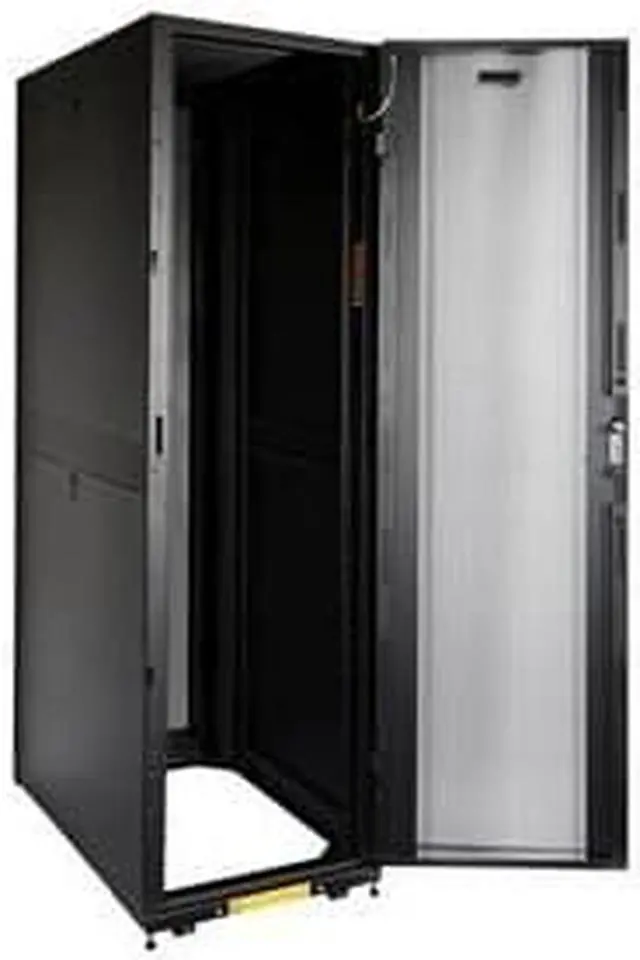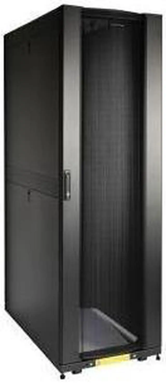 Capacity: 3000 lbs. (stationary), 2250 lbs. (dynamic). Roof removes easily with simple pull pin hinges for access during equipment installation even with cabling already in place. Perforated front and rear doors provide ventilation for servers and networking equipment. Reversible door has a simple lift off design for easy removal and reverse installation. Half height quick release side panels reduce size and weight for easy handling and access to equipment. Large toolless cable access slots in the roof provide access for overhead cable egress. Split rear doors improve equipment access and reduce floor space requirements. Join adjacent enclosure at 24 in centers to match standard data center floor tiles. Integrated electrical grounding roof, side panels and doors grounded to the enclosure frame, which has multiple connections for facility grounding. Includes keys, mounting hardware and user manual. Meets CE, DIN41491, DIN41494, EIA/ECA- 310-E, IEC 294-2, RoHS certifications and standards.