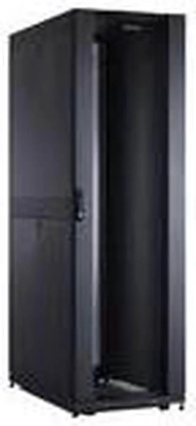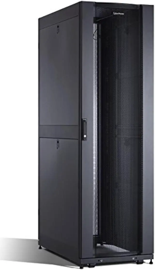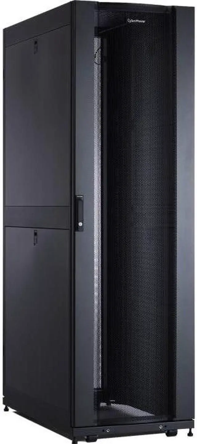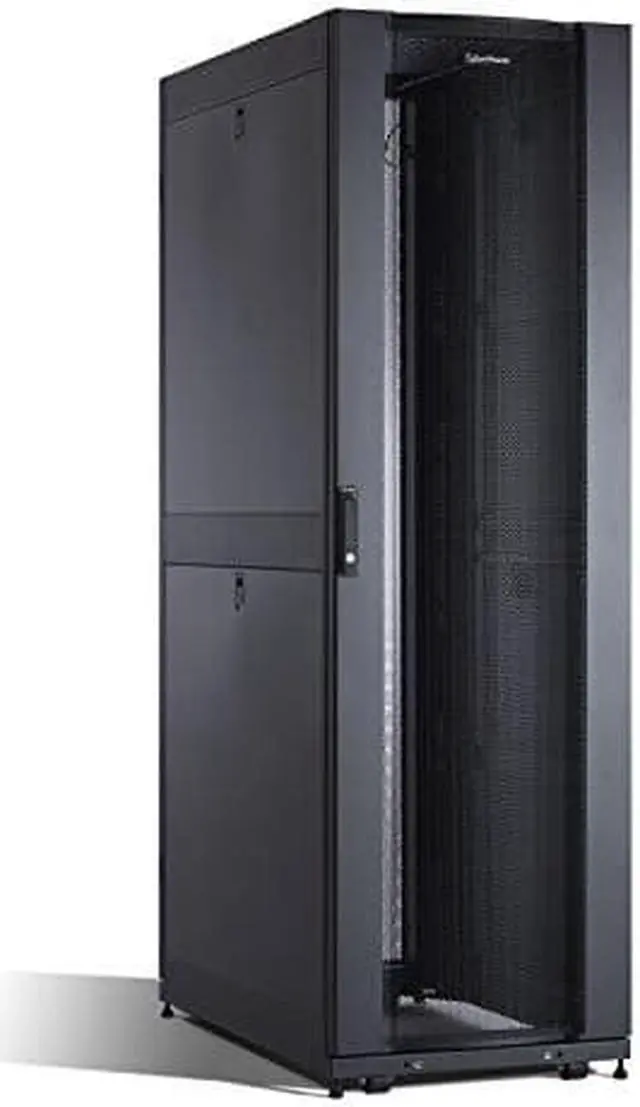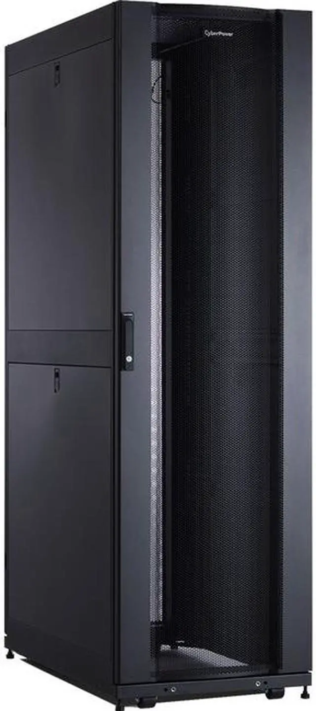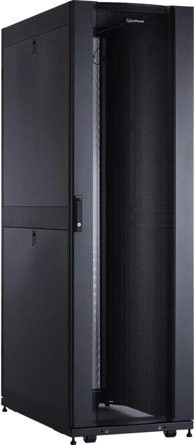 The CyberPower Carbon CR42U11001 standard rack enclosure is ideal for high-density server installations, network applications and data center environments. It features metal construction with black powder coat finish. This enclosures measuring 78.4" x 23.6" x 42.1", features perforated front door and sides panels to provide ventilation for servers and networking equipment. The front door is reversible and has spring loaded hinges to move easily to the opposite side. It withstands 3000 lbs stationary load and 2250 lbs dynamic load. The cable access openings slots of this enclosure provide convenient cable routing to and from the rack.