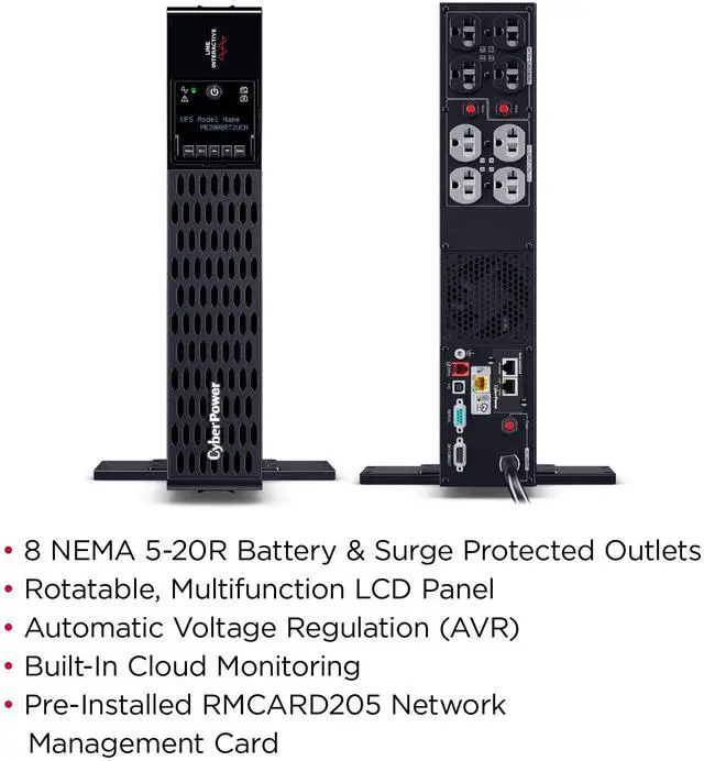 CyberPower PR2000RT2UCN Smart App Sinewave UPS Systems - 2000VA/2000W, 120 VAC, NEMA 5-20P, 2U, Rack / Tower, Sine Wave, 8 Outlets, LCD, PowerPanel® Business