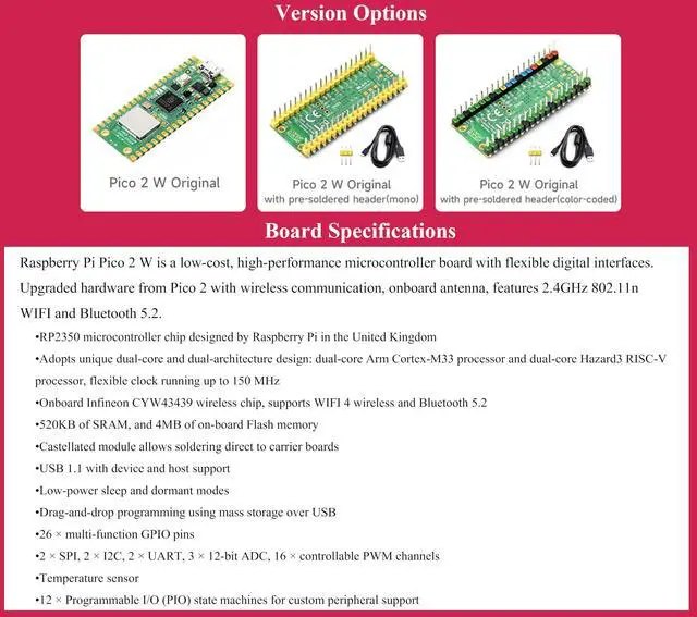 Pico 2 W With Pre-Soldered Header Compatible With Raspberry Pi Board, Kit +USB Cable, 2.4GHz 802.11n WiFi and Bluetooth 5.2, RP2350 Chip, Dual-Core & Dual-Architecture Design