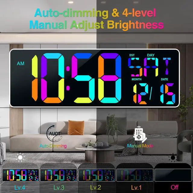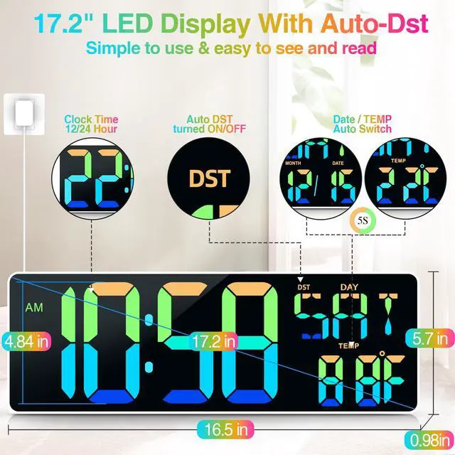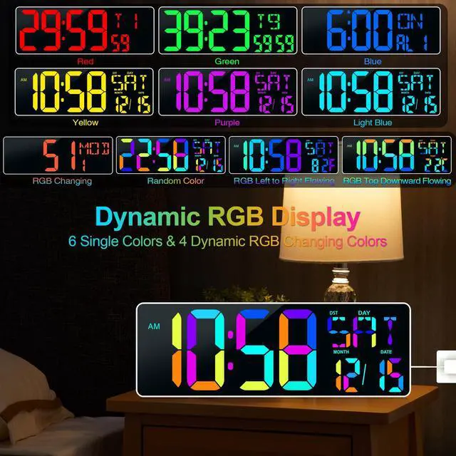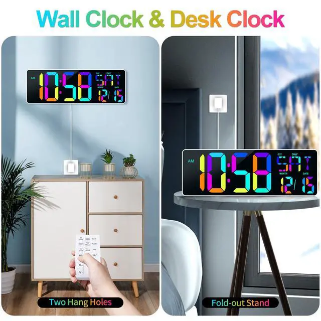 1. 10 Colors Available for 17.2 inch Digital HD LED Display: Our large digital wall clock have HD LED screen,180 degree visible, 10 colors available for time display; switch color by remote control or "SNOOZE" button on the back of the wall clock