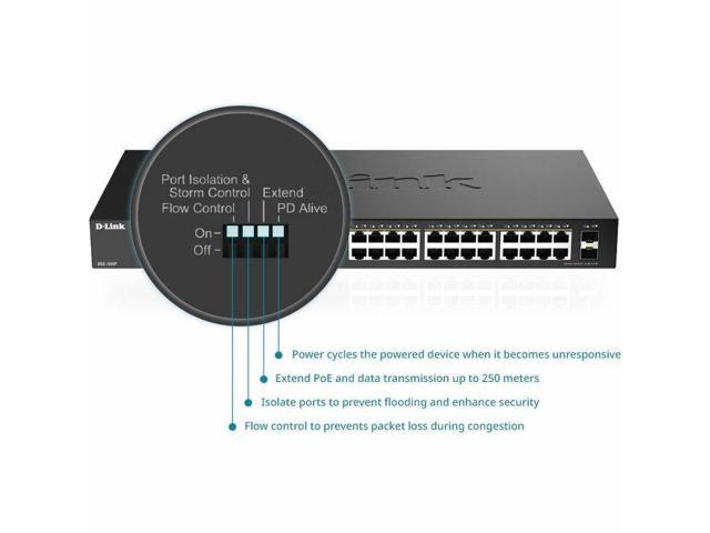 - The DGS-1026P allows users to quickly enable or disable key port features via the built-in DIP switch to adapt to network needs, including flow control, port isolation & storm control, PD alive, and Extend transmission mode, allowing fast and easy onsite configuration without having to access the web UI. The DGS-1026P also features a durable, compact metal case alongside