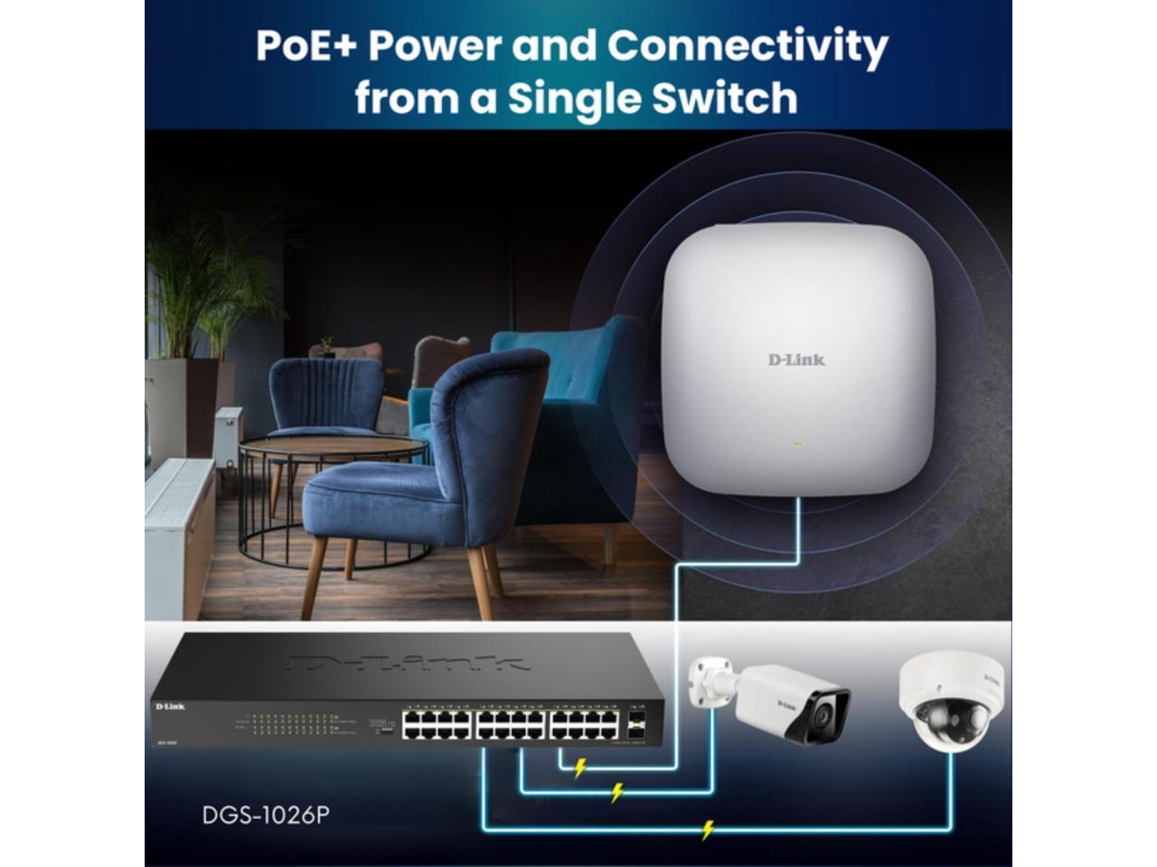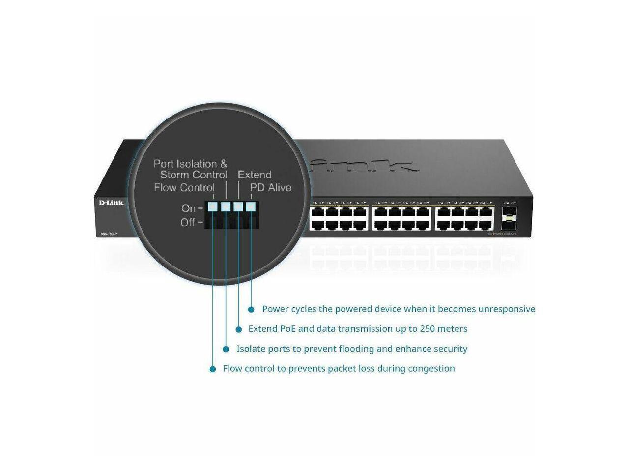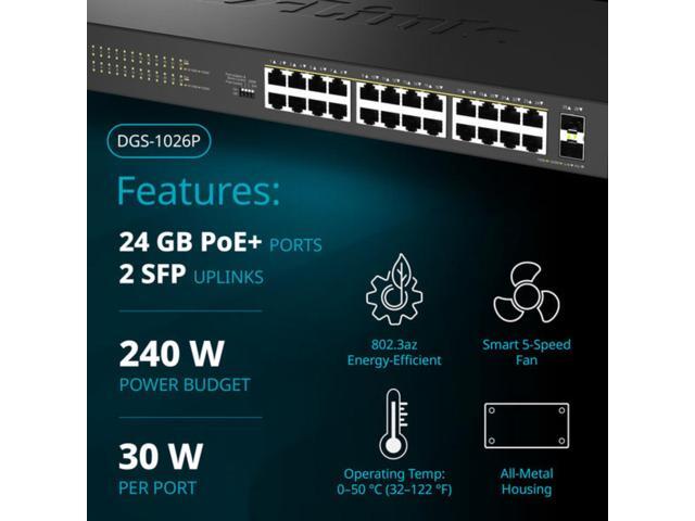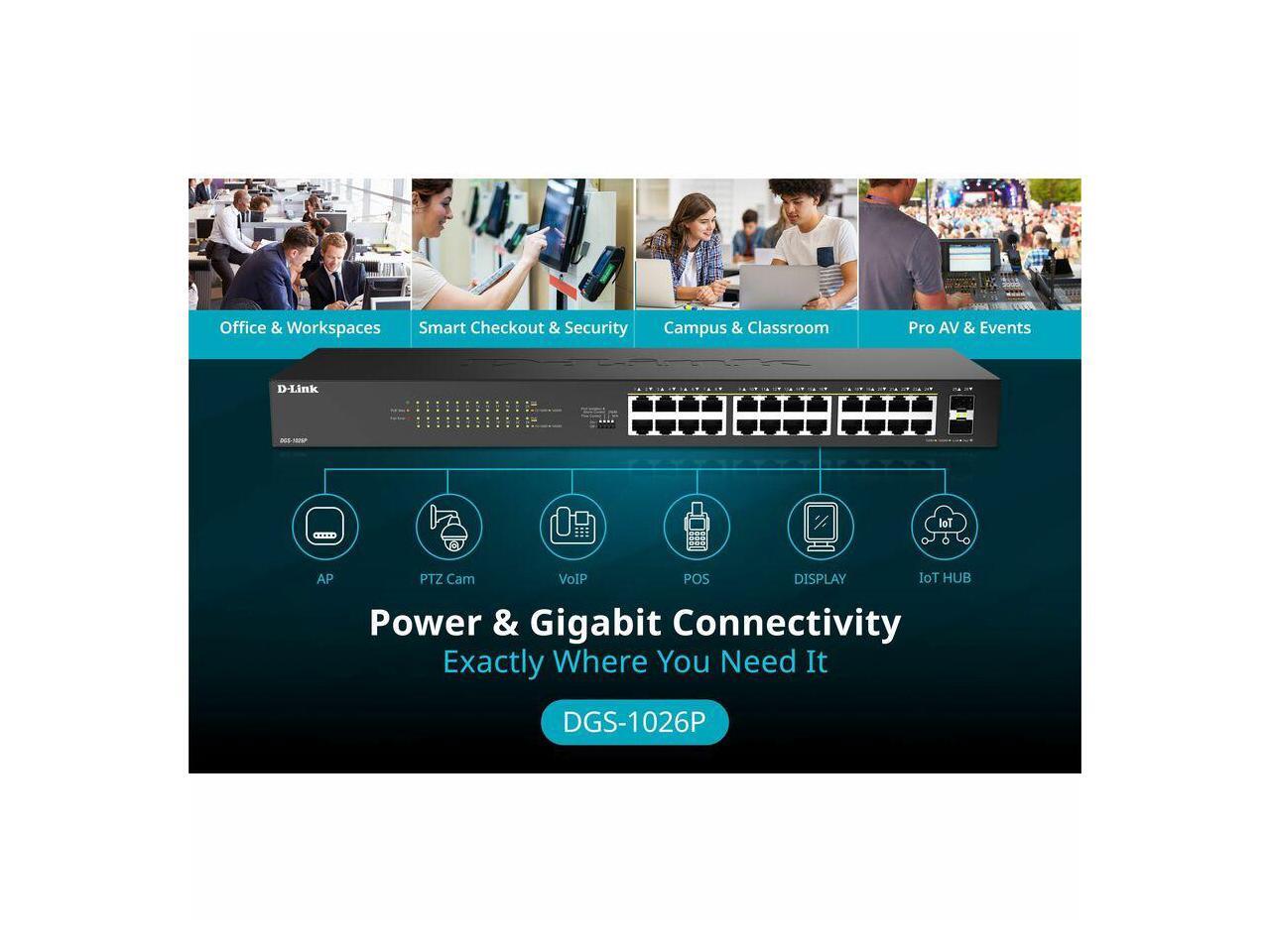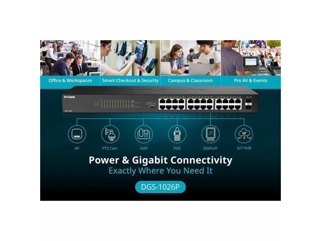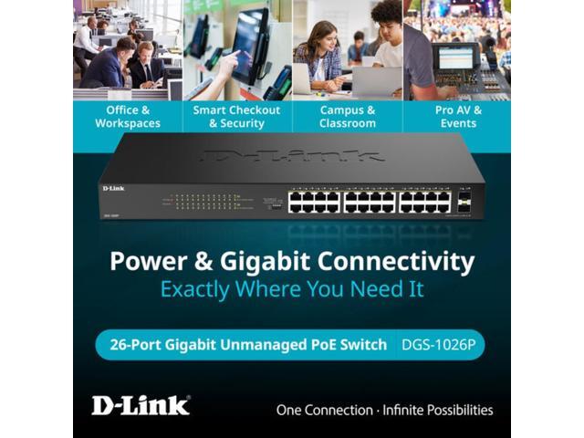 - The D-Link DGS-1026P 26-Port Gigabit Unmanaged PoE Switch offers an economical way for SOHO and Small-to-Medium Businesses (SMB) to take advantage of Gigabit Ethernet speeds, while reducing energy consumption and minimizing noise output.