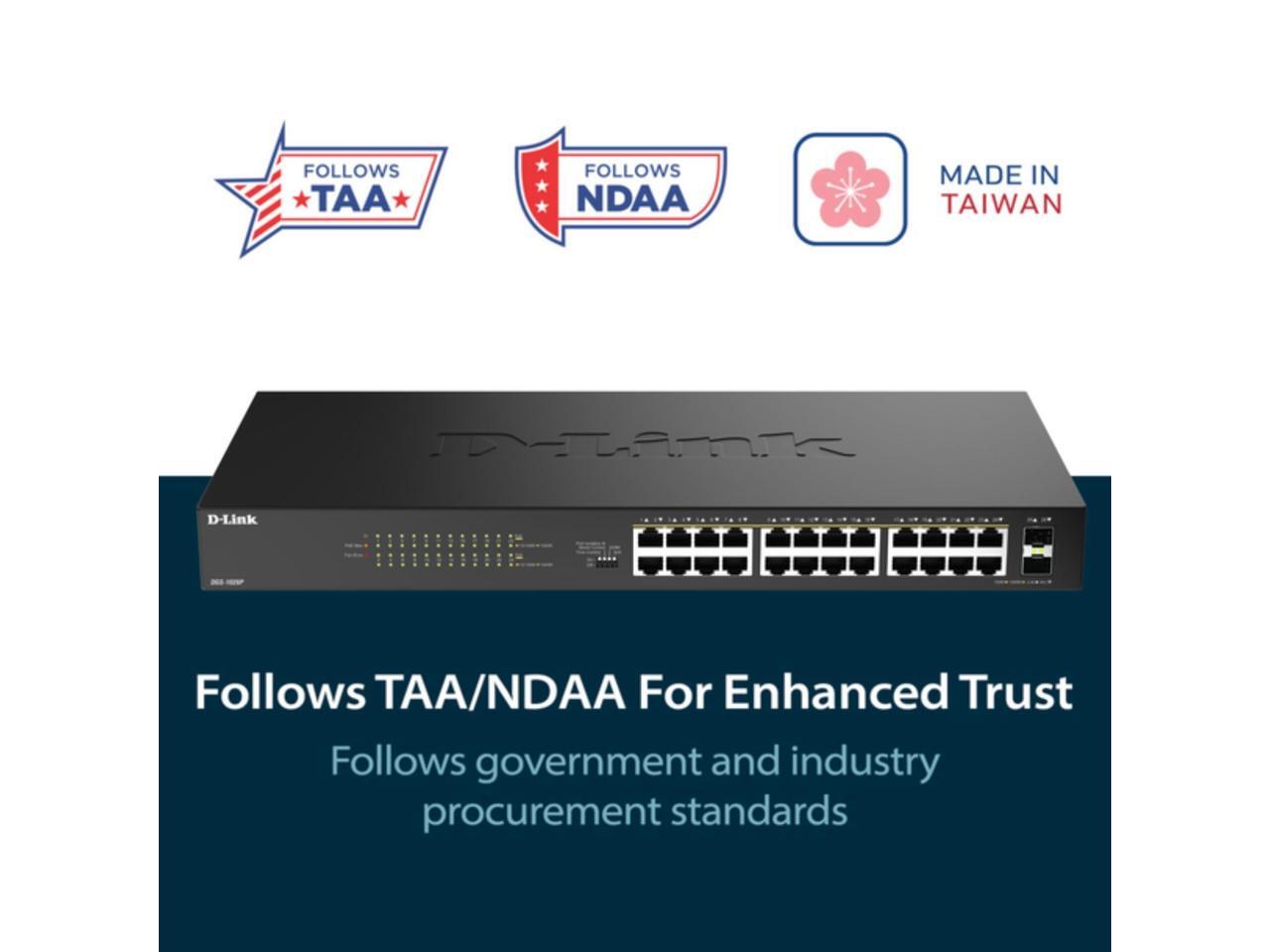 D-Link 26-Port Gigabit Unmanaged PoE Switch - 24 Ports - Gigabit Ethernet - 2 Layer Supported - 2 SFP Slots - 288.56 W Power Consumption - 240 W PoE Budget (DGS-1026P)