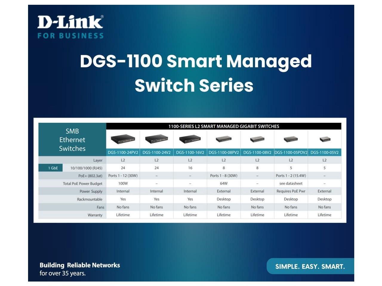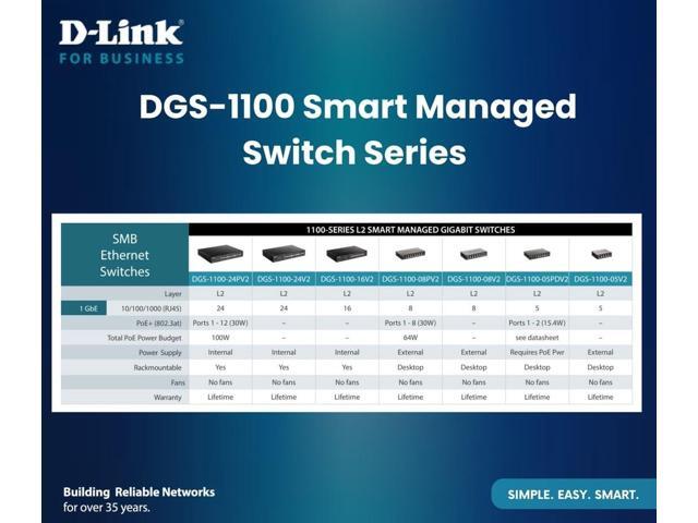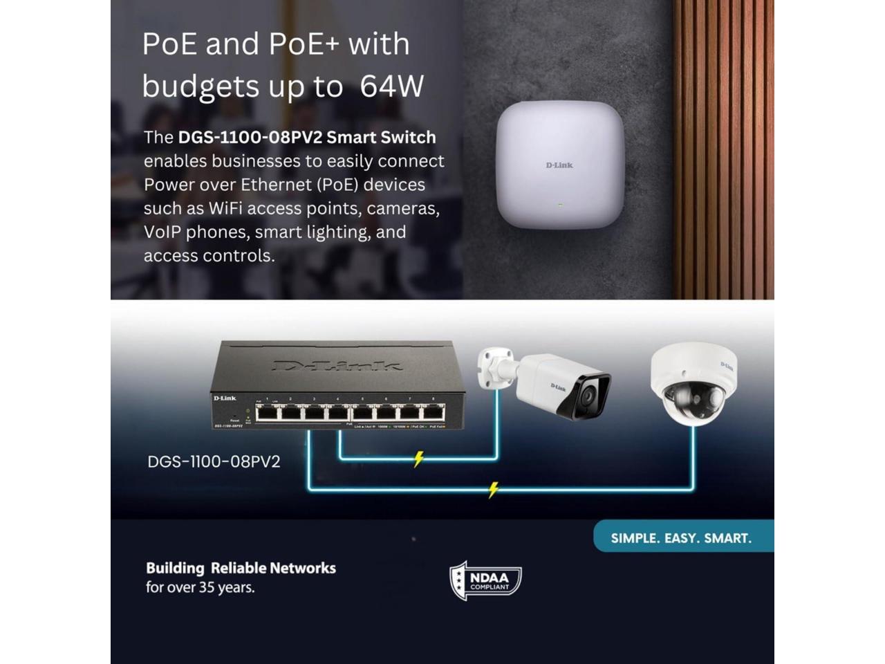 - POWERFUL PoE ON A BUDGET: 8 Gigabit PoE Ports packed in a compact design, support for IEEE 802.3at PoE with a PoE Power Budget of 64W, the DGS-1100-08PV2 is a great choice for businesses looking for a PoE solution on a budget