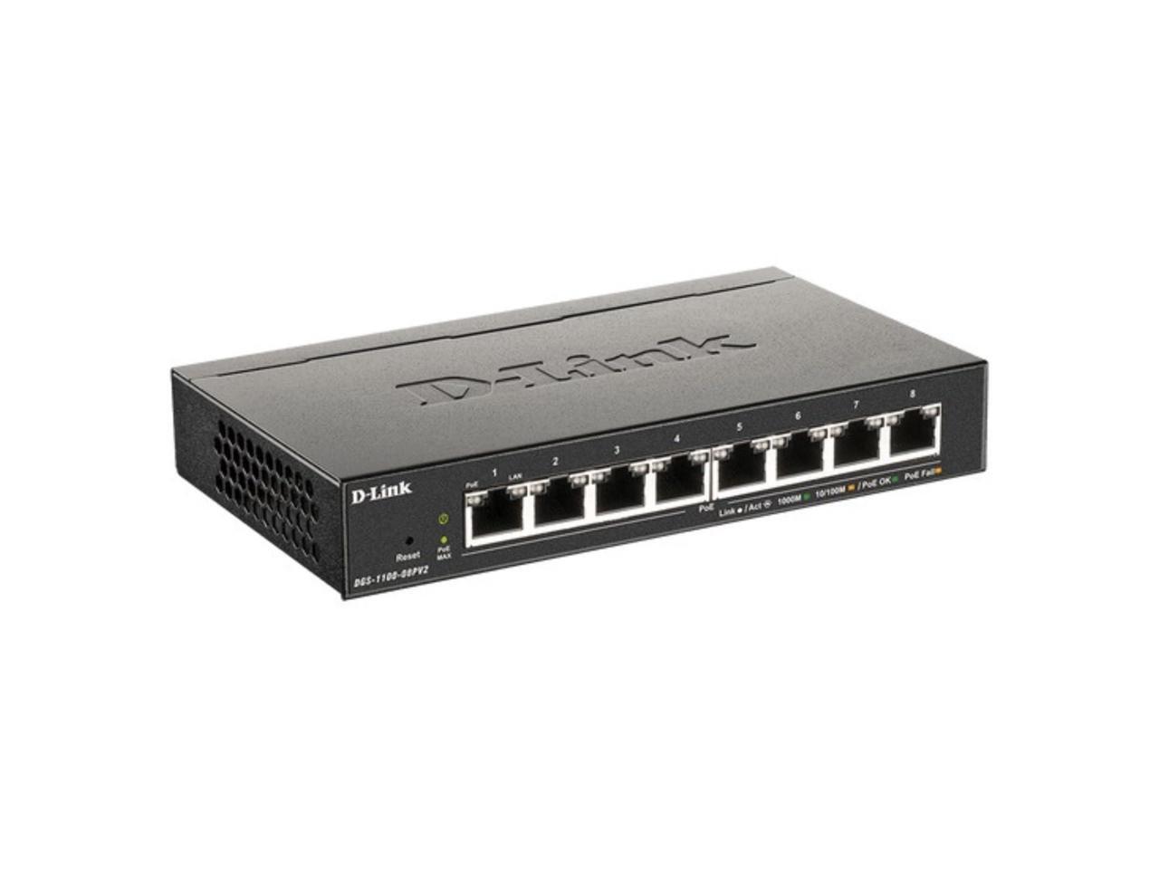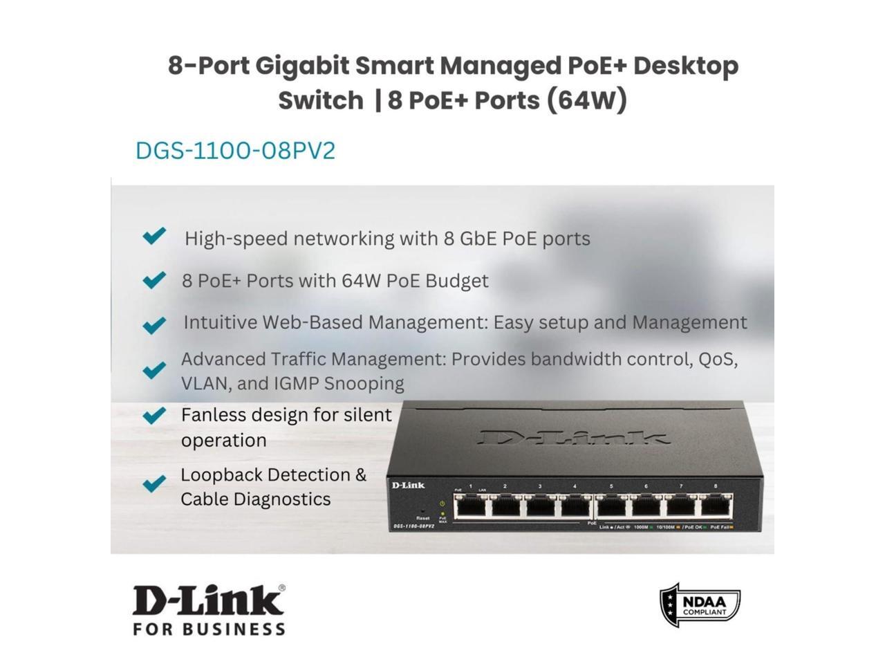 D-Link 8-Port Gigabit Smart Managed PoE+ Switch | 8 PoE+ Ports (64W) | Compact Metal Desktop |NDAA Compliant - (DGS-1100-08PV2)