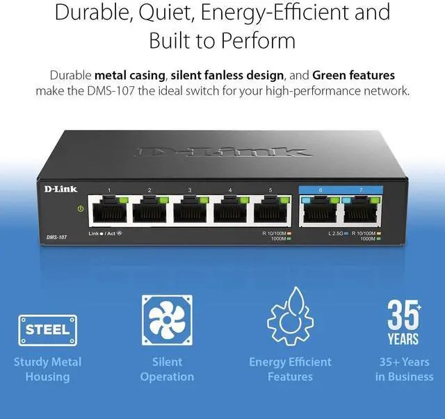 The DMS-107 7-Port Multi-Gig Switch is ideal for home office, gaming and small to medium-sized businesses (SMB) to add a quick and easy Multi-Gigabit upgrade to the network. The DMS-107 packs full functionality and Multi-Gigabit performance into a slim yet sturdy metal design. With auto-sensing ports, the DMS-107's 2 Multi-Gig ports intelligently senses the link speeds of your devices and adjusts between 3-speeds (100Mb/1G/2.5G) for compatibility and optimal performance. Using CAT5e or faster cables? Perfect! Instantly upgrade to 2.5 Gbps without the need to upgrade, reducing wiring costs and hassle.