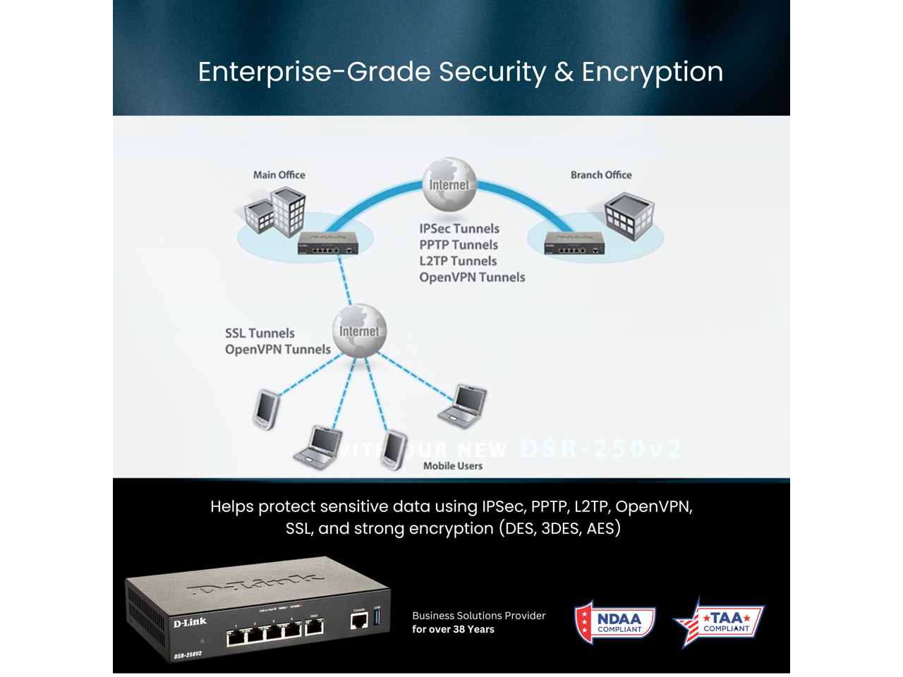D-Link Gigabit VPN Router | Perfect for Remote Work | 4 Port Gigabit Dual WAN Failover | Enterprise-Grade Encryption | TAA/NDAA Compliant (DSR-250V2)