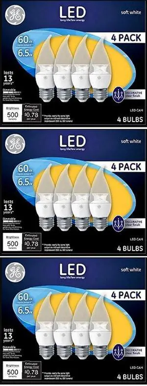 GE 94872 LED Decorative Chandelier bulbs, medium base, 6.5 watts, 500 lumens, Dimmable (quantity of 12 bulbs)