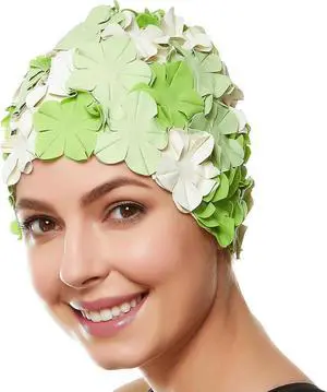 Beemo Floral Petal Ladies Bathing Swim Cap - Green/White