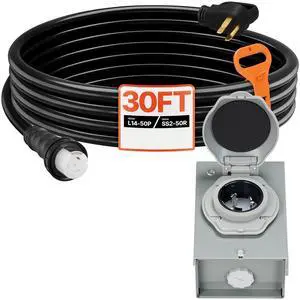VEVOR 50 Amp Generator Cord and Power Inlet Box, 30FT, 125V/250V STW 6/3 + 8/1 AWG Extension Power Cord, NEMA 14-50P to SS2-50R, Twist Lock Connector, Inlet Box Kit, for Generator to House, ETL Listed