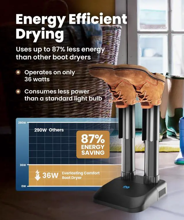 EASY ENERGY-EFFICIENT OPERATION: Consuming only 36 watts of power, our convection boot heaters use less energy than a light bulb. It can run overnight safely without adding noticeable costs to electric bills. Dependable for daily drying cycles, it delivers strong results with minimal electricity consumption, making it an eco-friendly choice for family households, cabins, and worksites.