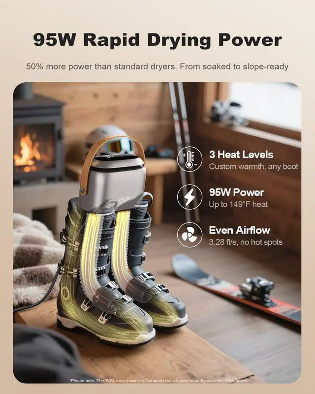 The boot dryer reaches a controlled maximum of 149°F. This safe range dries efficiently without harming footwear, from sneakers to leather boots.