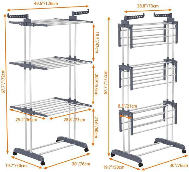 4-TIER Oversized Clothes Drying Rack: Size: 67.7H x 19.7W x 30L Inches. Oversized 4-tier design and 2 wing hooks for drying towels, socks, clothes, shoes, quilts, etc. There are a total of 24 pillars, 14 hooks on 2 side wings for additional hanging drying. Oversized drying rack for drying up to 62 clothes. There is enough space to dry whole family's clothes.