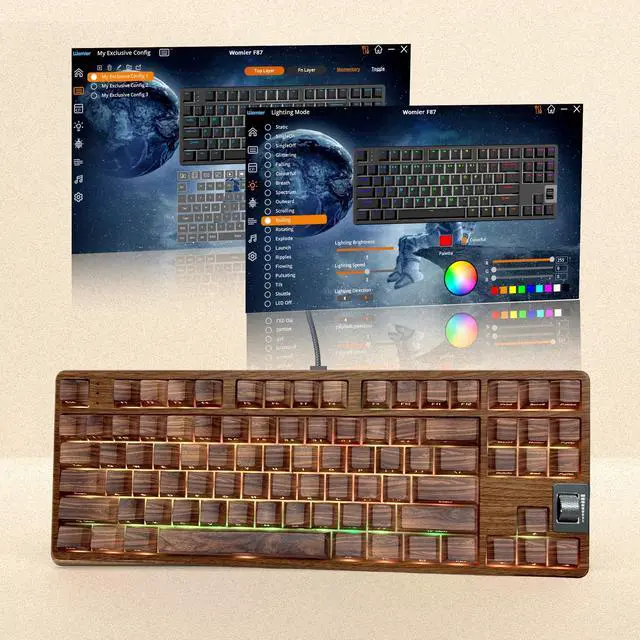 - [Wired Mechanical keyboard]The Womier F87 mechanical keyboard only supports Type-C connection. It uses water transfer technology to print the walnut pattern on the ABS keyboard shell, and adds a glossy oil protective film, the pattern is clear, bright color is not easy to fall off.The bottom case and top cover of the F87 keyboard are made of ABS, not walnut wood. The keyboard is just a walnut texture theme. Thank you for your support.