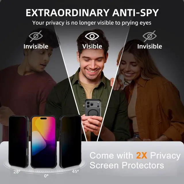Compatibility: only for iPhone 17 Pro Max 6.9-inch, Precise cutouts for effortlessly access all ports. Not interfere with camera and flash!Compatible with MagSafe: Built in N52 magnetic ring, 50% stronger than official iPhone 17 Pro Max magnetic case, never shaken off even violent swinging, compatible with all MagSafe accessories, including magnetic charger, car mount, wallets, etc.Come with 2 Pcs Privacy Screen Protectors: The screen is only visible to the person in front, keeps your private moments and sensitive details from the curious eyes of strangers, especially on the bus, elevator, metro, or other public occasions.Upgrade Full Camera Protection: Unique built-in camera cover enhanced camera protection, prevents your iPhone 17 Pro Max camera from any shatter, scratch, or dust. Meanwhile, makes your camera color match the iPhone 17 Pro Max case, looks more uniform and fashional.15ft Drop Protection: Certified to military grade drop test standards, MIL-STD-810G, for drops up to 15ft for your iPhone; Safely guard your iPhone 17 Pro Max smart phone from serious drops, scrapes and bumps.
