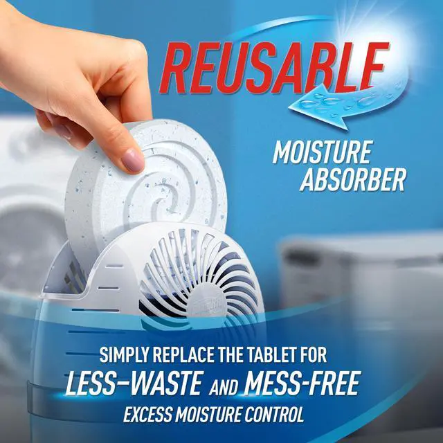 Dont just cover up odors, eliminate them with DampRid Reusable Moisture Absorber with 4 Drop-In Tablets. The 360-degree ventilation system enhances airflow, making it our fastest acting moisture absorber. To use, simply insert an unwrapped tablet into the top of the moisture collection unit. DampRid crystals absorb excess moisture out of the air without use of electricity or batteries. Time-Release Fragrance Technology releases a pleasant scent over the life of the product. Place these moisture absorbers in closets, bathrooms, laundry rooms, pantries, storage units, basements, garages, stored boats and RVS anywhere damp, stagnant air is a problem. When tablet has dissolved, empty liquid in toilet or drain and rinse out container residue before refilling with new tablet. DampRid Moisture Absorber Drop-In Tablet Refill packs are sold separately. Refill tablets are available in Fresh Scent and Fragrance Free. Keep out of reach of children and do not use in moving vehicles. Read and follow all label directions.