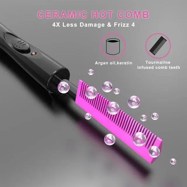 Ceramic hot comb: Argan oil, keratin & tourmaline infused comb teeth,Ceramic coating hot comb distribute heat evenly, release negative ions when heated, the ions will lock in the moisture of the hair, which can reduce static and frizz,effectively smooth frizz for healthier, softer hair, Shiny
