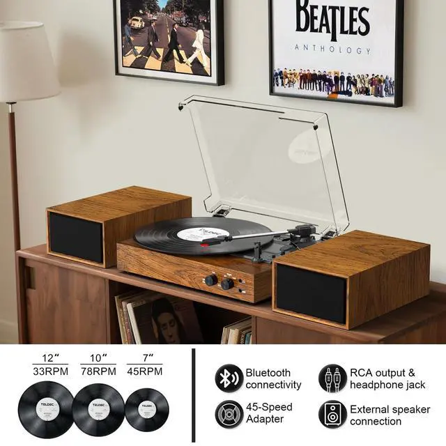 This Bluetooth compatible record player comes with good speakers, or you can hook it up to external speakers or Hi-fi audio system via RCA line-out. Belt drive system, protective dust cover, adajutable speed with an auto-stop feature, the perfect gift for music vinyl lovers.