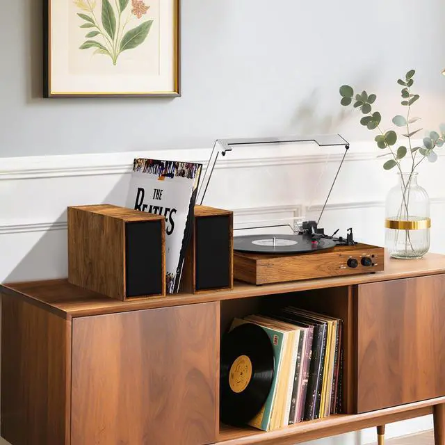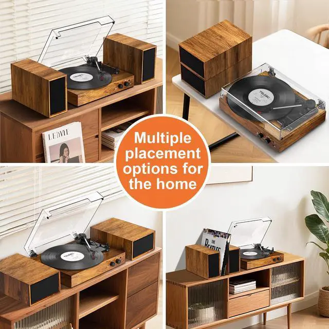 The design of this turntable offers a multiple placement choices: You can place the turntable on top of the stereo speakers for compact space, or use the dual speakers working as a record storage on your bookshelf.