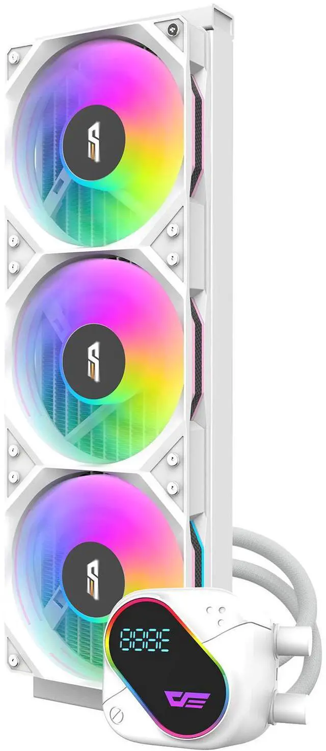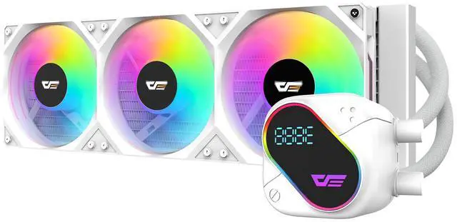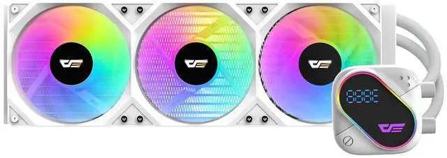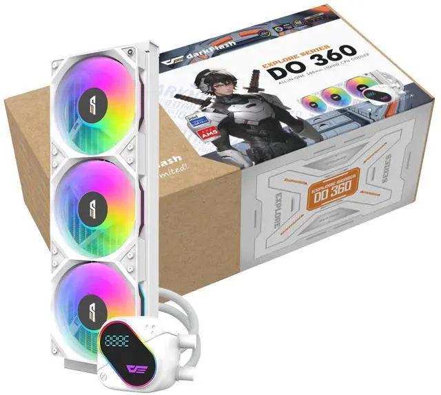 The darkFlash EXPLORE DO360 360mm AIO Liquid CPU Cooler is a high-performance cooling solution designed for gamers and PC builders. Featuring a segment LCD screen, it allows for real-time monitoring of CPU temperature and system data. With a copper base, 3x 120mm hydraulic bearing fans, and a 3000 RPM pump, the DO360 provides powerful cooling performance while keeping noise levels low at just 36dBA under load. 5V addressable ARGB lighting allows for customizable color effects, adding a sleek touch to your build. The cooler is compatible with Intel LGA 115x, 1200, 1700 and AMD AM4, AM5 sockets, ensuring broad compatibility across a wide range of processors. With PWM speed control, the fans automatically adjust their speed for optimal cooling and noise reduction. Available in black and white, the DO360 combines excellent performance, aesthetic appeal, and ease of installation, making it the perfect choice for high-end builds.