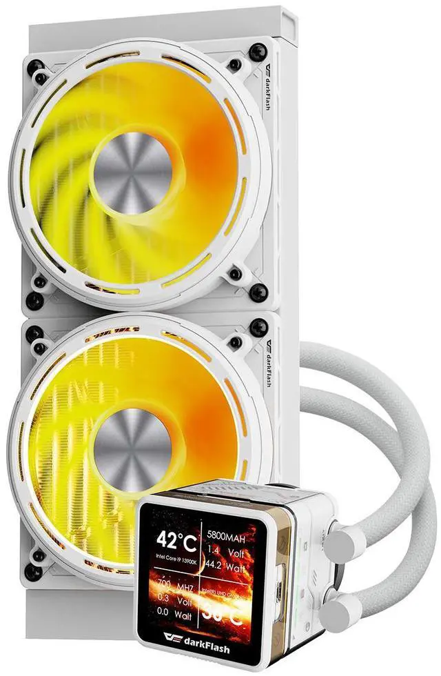 The darkFlash DE240 AIO Liquid CPU Cooler is designed to deliver high-performance cooling with a sleek 240mm radiator and dual 120mm PWM fans. The 2.88 -inch IPS LCD display shows real-time CPU temperature and system status, offering a modern and functional touch to your build. With a high-performance pump and copper cold plate, it ensures superior heat dissipation and keeps your CPU cool even under heavy loads. The cooler is compatible with Intel LGA 1700/1200/115X/1366 and AMD AM5/AM4 sockets and features full ARGB lighting, allowing you to customize your builds aesthetics. Offering efficient cooling with low noise (36 dBA), the DE240 is ideal for gamers, creators, and enthusiasts looking for a quiet yet powerful cooling solution for their high-performance systems.