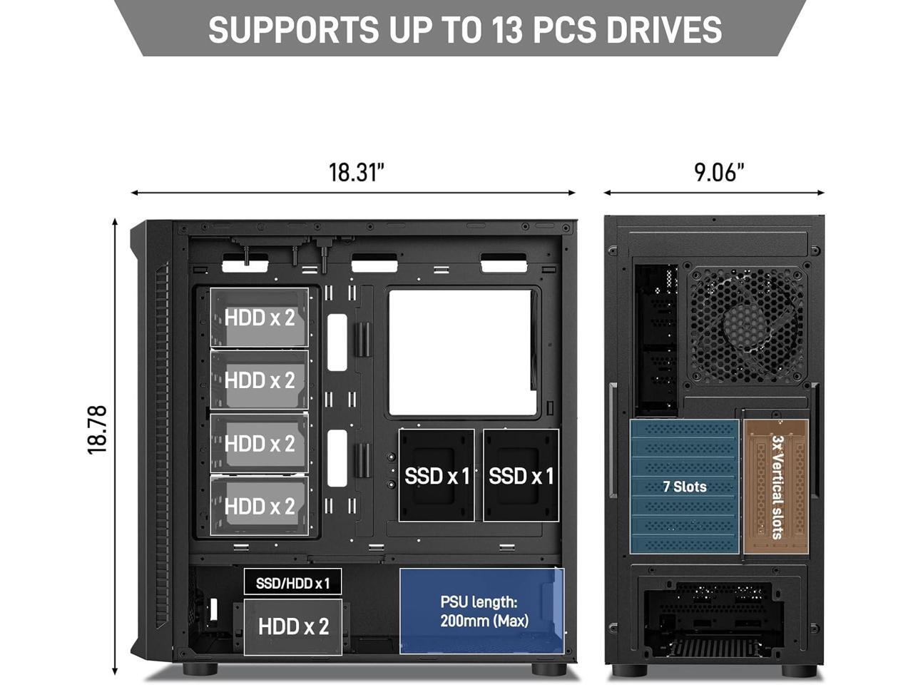 - Supports up to 13 Hard Drives: Supports up to 13 hard disks (10x 3.5 HDD + 3x 2.5 SDD) to reduce storage space shortage, which ensures you have sufficient storage for all your games and data