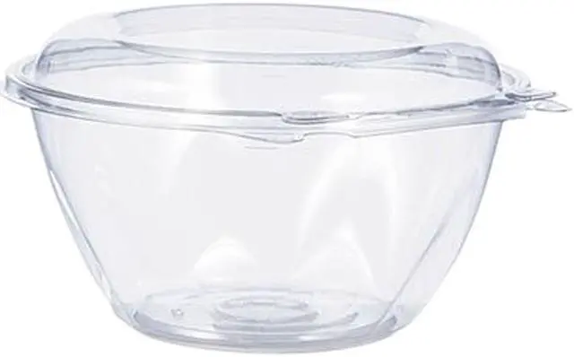 TamperAlert hinge protrudes outward when torn, alerting the customer that the container has been opened. Hinge remains attached to the container, meaning no loose plastic pieces and therefore no littering. MicroTrim edge contributes to tamper-resistance by inhibiting the ability to lift up the lid from the base without tearing the hinge. 360 degree leak-resistant perimeter seal completely seals entire tray for maximum freshness and to prevent leaks. Recessed stacking platform provides greater stability of merchandising displays. Offset opening tabs and lift and hold embossing makes SafeSeal bowls easier to open. Crystal clear container with minimal sidewall ribbing. Food Container Type: Base/Lid Combo; Material(s): Plastic; Food Container Material Type: Plastic; Capacity (Volume): 32 oz.