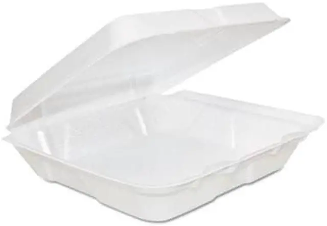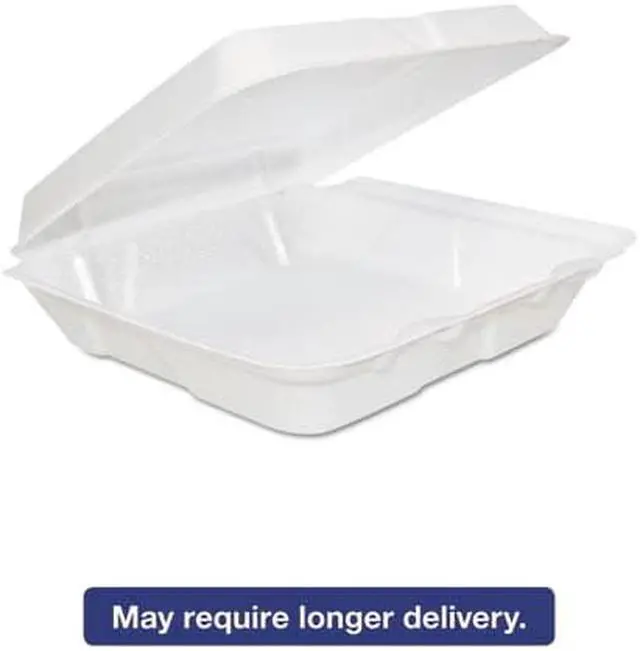 Insulated to accommodate both hot and cold foods. Non-absorbent. Stackable. Food Container Type: Hinged Lid Container; Material(s): Extruded Polystyrene; Material Type: Foam; Color(s): White.